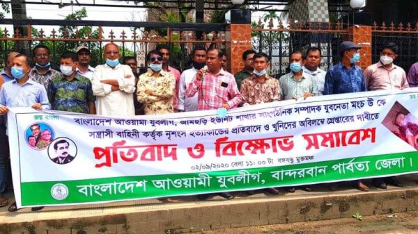গত ১লা সেপ্টেম্বর মঙ্গলবার পার্বত্য জেলা বান্দরবানে উপজাতি আঞ্চলিক সশস্ত্র সন্ত্রাসীদের গুলিতে যুবলীগের ইউনিট কমিটির সাংগঠনিক সম্পাদক মং চিংউ মার্মা হত্যার প্রতিবাদে বিক্ষোভ মিছিল ও প্রতিবাদ সভা করেছে জেলা যুবলীগের নেতাকর্মীরা। গত বুধবার (২ সেপ্টেম্বর) বেলা ১২টার দিকে এ বিক্ষোভ মিছিল ও প্রতিবাদ সভা অনুষ্ঠিত হয়। মিছিলটি জেলা শহরের দলীয় কার্যালয় থেকে শুরু হয়ে বঙ্গবন্ধু মুক্ত মঞ্চে গিয়ে শেষ হয়।