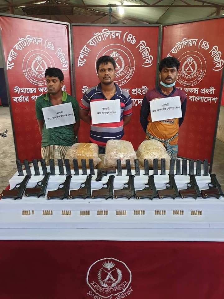 বর্ডার গার্ড বাংলাদেশ(বিজিবি) কর্তৃক অভিযান চালিয়ে যশোর সীমান্ত হতে ভারতীয় ১১টি পিস্তল, ২২টি ম্যাগাজিন, গুলি ৫০ রাউন্ড এবং ১৪ কেজি গাঁজাসহ ৩ জনকে আটক করার খবর পাওয়া গেছে।