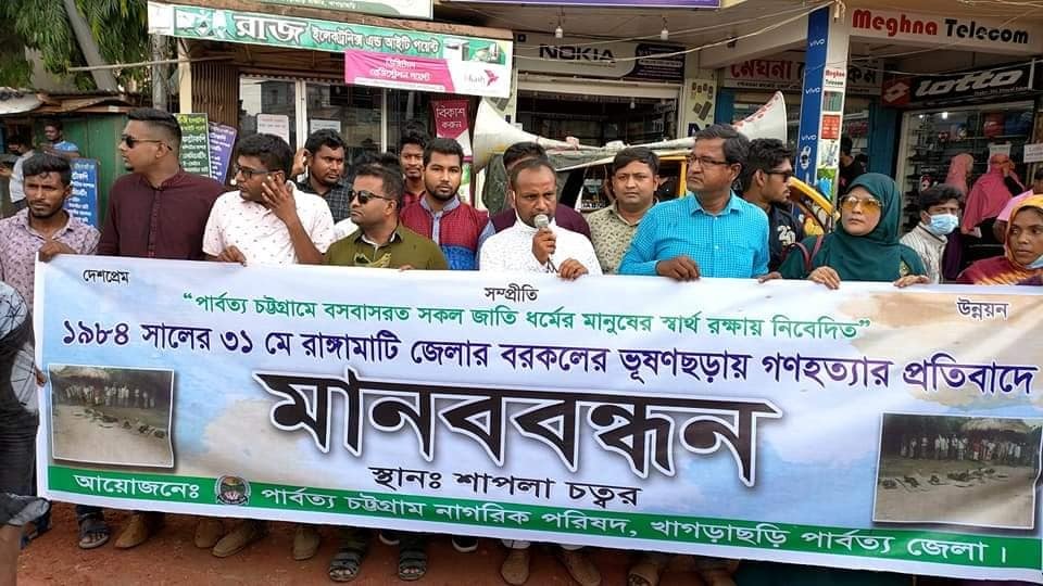 ১৯৮৪ সালে রাঙ্গামাটির ভূষণছড়ায় গণহত্যার প্রতিবাদ ও বিচার চেয়ে খাগড়াছড়িতে মানববন্ধন করেছে পার্বত্য চট্টগ্রাম নাগরিক পরিষদ। গত ৩১মে সোমবার দুপুরে শহরের শাপলা চত্ত্বরে এ কর্মসূচির আয়োজন করে সংগঠনটির খাগড়াছড়ি শাখার নেতৃবৃন্দরা।