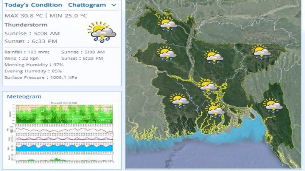 আজ সকাল ৯টা থেকে ২৪ ঘণ্টার আবহাওয়ার পূর্বাভাসে বলা হয়েছে, ঢাকা, ময়মনসিংহ, খুলনা, বরিশাল, চট্টগ্রাম ও সিলেট বিভাগের অনেক জায়গায় এবং রংপুর ও রাজশাহী বিভাগের কিছু কিছু জায়গায় অস্থায়ীভাবে দমকা/ঝড়ো হাওয়াসহ হালকা থেকে মাঝারি ধরনের বৃষ্টি বা বজ্রসহ বৃষ্টি হতে পারে। সেই সাথে দেশের কোথাও কোথাও মাঝারি ধরনের ভারী থেকে ভারী বর্ষণ হতে পারে। তবে তাপমাত্রা অপরিবর্তিত থাকবে।
