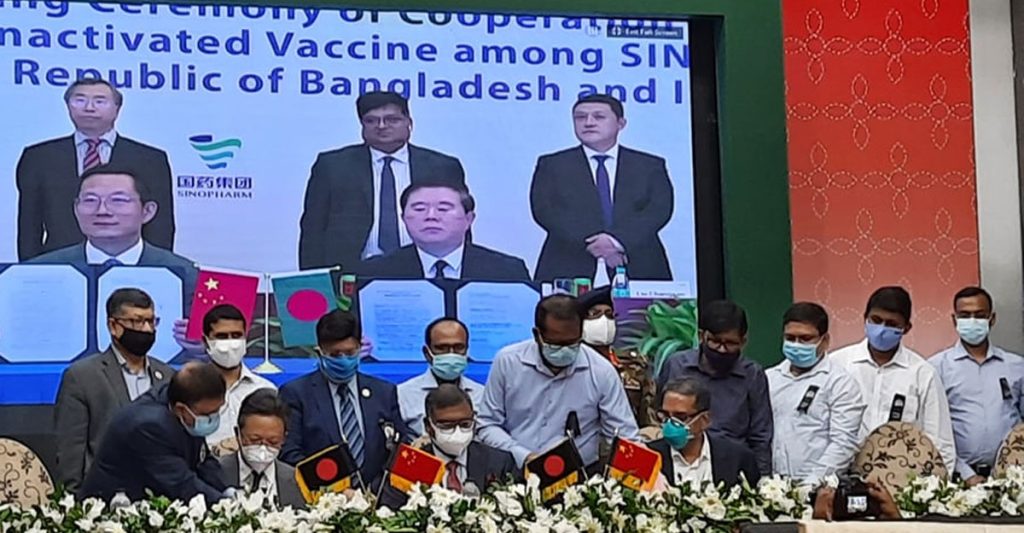 সমঝােতা চুক্তিতে স্বাক্ষর করেন স্বাস্থ্যমন্ত্রী জাহিদ মালেক, চীনের রাষ্ট্রদূত মি. লি জিমিং এবং ইনসেপ্টা ভ্যাকসিন লিমিটেড ও ইনসেপ্টা ফার্মাসিউটিক্যালস লিমিটেডের চেয়ারম্যান আব্দুল মুক্তাদির।