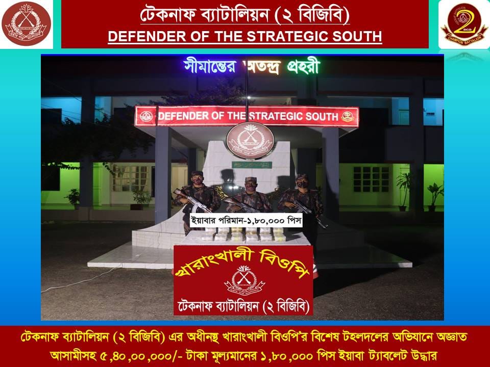 ইতোমধ্যে খারাংখালী বিওপি হতে আরও একটি টহল রিইনফোর্সমেন্ট হিসেবে পাঠানেরা হয়। যৌথ টহল দল ঘটনাস্থলে ব্যাপক তল্লাশি চালিয়ে নদীর তীর থেকে ২টি বস্তা উদ্ধার করে। ওই বস্তা থেকে ৫ কোটি ৪০ লাখ টাকা মূল্যের ১লাখ ৮০ হাজার পিস ইয়াবা ট্যাবলেট জব্দ করা হয়। মাদক কারবারিদের আটকের নিমিত্তে বর্ণিত এলাকা ও পার্শ্ববর্তী স্থানে পরবর্তীতে অভিযান পরিচালনা করা হলেও কোনো মাদক কারবারি কিংবা তাদের সহযোগীকে আটক করা সম্ভব হয়নি। তবে, মাদক কারবারিদের শনাক্ত করার জন্য ওই ব্যাটালিয়নের গোয়েন্দা কার্যক্রম চলমান