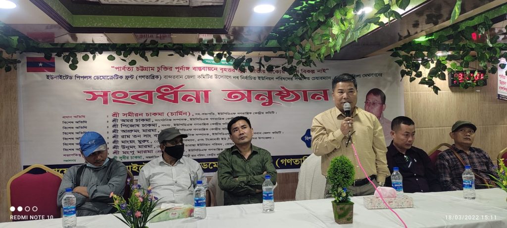 ১৮ মার্চ (শুক্রবার) বিকালে বান্দরবান হিলভিউ কনফারেন্স হল রুমে ইউনাইডেট পিপলস ডেমোক্রেটিক ফ্রন্ট (গনতান্ত্রিক) জেলা কমিটি সভাপতি (হেডম্যান) মংপু মারমা সভাপতিত্বে সংবর্ধনা অনুষ্ঠানে প্রধান অতিথি হিসেবে উপস্থিত ছিলেন ইউনাইডেট পিপলস ডেমোক্রেটিক ফ্রন্ট (গনতান্ত্রিক) কেন্দ্রীয় কমিটি সহ- সভাপতি সমীরন চাকমা (চার্মিন)।