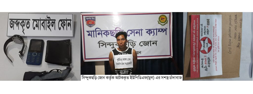 জানা যায়, গোপন গোয়েন্দা তথ্যের ভিত্তিতে মানিকছড়ি উপজেলার মানিকছড়ি আর্মি ক্যাম্প অধীনস্থ সিন্দুকছড়ি বাজার এলাকায় এক ব্যবসায়ীর নিকট থেকে চাঁদা আদায়ের সময় সুইচিংনু মারমা কে চাঁদা আদায়ের রশিদসহ আটক করে সেনা সদস্যরা।