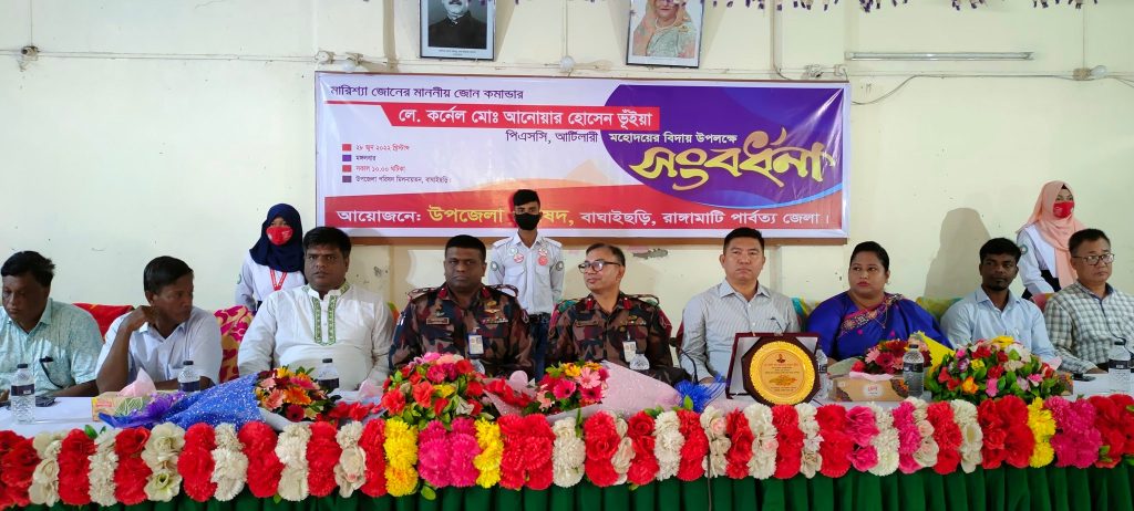 রাঙামাটির বাঘাইছড়িতে ২৭ বিজিবি মারিশ্যা জোনের বিদায়ী জোন অধিনায়ক লেঃ কর্নেল আনোয়ার হোসেন ভূইয়াকে বিদায় সংবর্ধনা ও নবাগত জোন অধিনায়ক লেঃ কর্নেল মোহাম্মদ শরিফুল আবেদ এবং নবাগত উপজেলা নির্বাহী অফিসার রোমানা আক্তারকে সংবর্ধনা দিয়েছে উপজেলা পরিষদ।