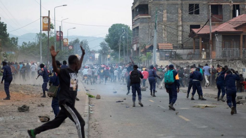 গোমাতে সোমবার জাতিসংঘের মনুস্কা মিশনের একটি কয়েকশ’ মানুষ হামলা চালায় ও লুটপাট করে। বিক্ষোভকারীরা মিশনের দেশত্যাগের দাবি জানায়। মঙ্গলবার আবারও বিক্ষোভ করেন তারা।
