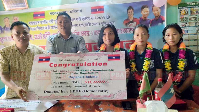 এসময় ৫ কৃতি ফুটবল কন্যা ঋতুপর্ণা চাকমা, রুপনা চাকমা, আনাই মগিনী, আনুচিং মগিনী, মনিকা চাকমা ও সহকারী কোচ তৃষ্ণা চাকমাদের সম্মাননা ক্রেষ্ট ও প্রতিজনকে ৫০ হাজার টাকা করে ৬ জনকে ৩ লক্ষ টাকার চেক তুলে দিয়ে মিষ্টি মুখ করানো হয়।