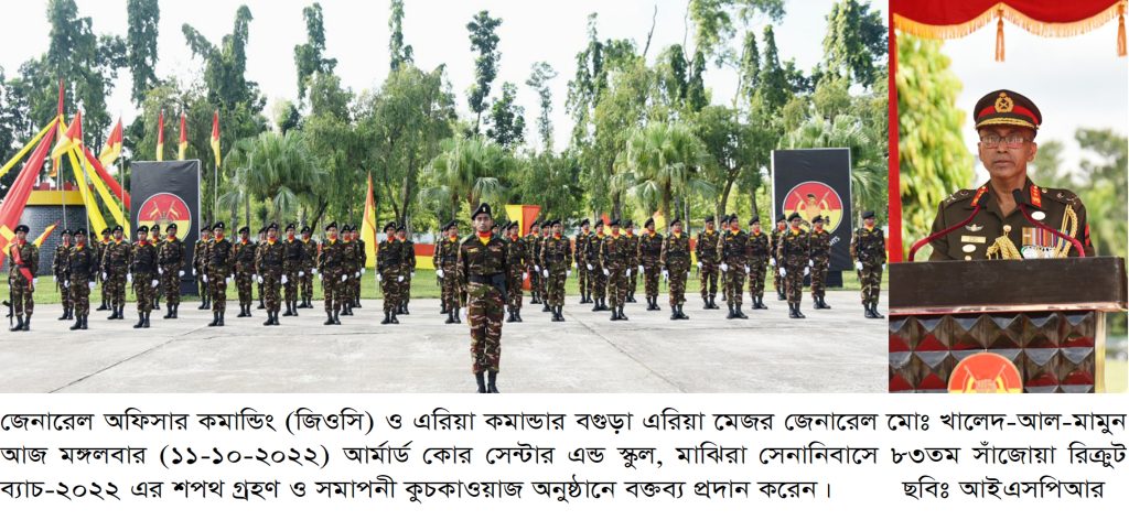 বাংলাদেশ সেনাবাহিনীর সাঁজোয়া কোরের ৮৩তম রিক্রুট ব্যাচের শপথ গ্রহণ ও সমাপনী কুচকাওয়াজ অনুষ্ঠান আজ মঙ্গলবার (১১ অক্টোবর) আর্মার্ড কোর সেন্টার এন্ড স্কুল, মাঝিরা সেনানিবাস বগুড়ায় অনুষ্ঠিত হয়।