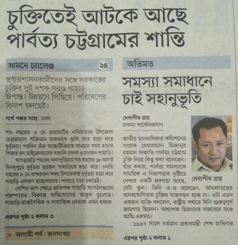 আজকের প্রথম আলো পত্রিকা পড়লাম। পত্রিকার প্রথম পৃষ্ঠায় “চুক্তিতেই আটকে আছে পার্বত্য চট্টগ্রামের শান্তি” শিরোনামে এক লেখনীতে জনাব দেবাশীষ রায় অভিমত দিয়ে বলেছেন- “সমস্যা সমাধানে চাই সহানুভূতি”। তিনি আরো বলেছেন- “মনের সংকীর্ণতা, পাহাড়ের প্রশাসনিক, রাজনৈতিক ইতিহাস না জানা বা জেনেও তাকে অবজ্ঞা করার চেষ্টার জন্যই আজকের সমস্যা চলছে”।