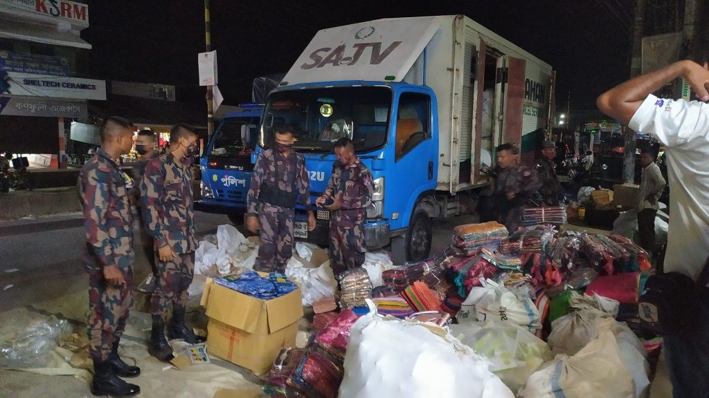 খাগড়াছড়িতে বৌদ্ধমূর্তি, শাড়ি ও সিগারেটসহ বিপুল পরিমাণ ভারতীয় পণ্য জব্দ, এস.এ পরিবহনের ৩ কর্মকর্তা আটক