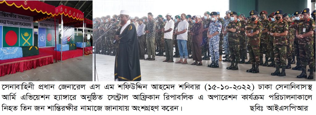 জাতিসংঘ শান্তিরক্ষা মিশনে অপারেশন কার্যক্রম পরিচালনাকালে ইমপ্রোভাইজড এক্সপ্লোসিভ ডিভাইস (আইইডি) বিস্ফোরণে নিহত তিন জন বাংলাদেশী শান্তিরক্ষীর নামাজে জানাযা আজ শনিবার (১৫ অক্টোবর ) ঢাকা সেনানিবাসের আর্মি এভিয়েশন হ্যাঙ্গার এ অনুষ্ঠিত হয়।