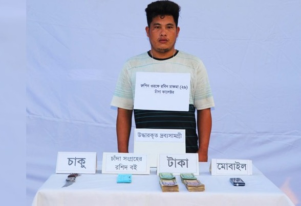 রাঙামাটি পার্বত্য জেলার বাঘাইছড়ি উপজেলার সাজেক ইউনিয়নের মাচালং বাজার এলাকায় অবৈধ অস্ত্র ঠেকিয়ে সাধারণ ব্যবসায়দৈর কাছ থেকে আদায়কৃত চাঁদাবাজি ৩ লাখ টাকাসহ প্রসীত বিকাশ খীসার নেতৃত্বাধীন ইউপিডিএফ এর চাঁদা কালেক্টর রুপিন ওরফে রবিন চাকমা (২৬)কে আটক করেছে নিরাপত্তা বাহিনীর সদস্যরা।