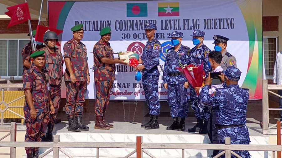 বর্ডার গার্ড বাংলাদেশ (বিজিবি) ও মিয়ানমারের সীমান্তরক্ষী বর্ডার গার্ড পুলিশের (বিজিপি) ব্যাটালিয়ন কমান্ডার পর্যায়ে পতাকা বৈঠক অনুষ্ঠিত হয়েছে। রবিবার সকাল সাড়ে ৯টায় নাফনদ সংলগ্ন সীমান্তে টেকনাফের শাহপরীর দ্বীপে বিজিবির নির্মিত সাউদার্ন পয়েন্ট রিসোর্টের সম্মেলন কক্ষে দু দেশের প্রতিনিধি দলের মধ্যে বৈঠক শুরু হয়। পাঁচ ঘণ্টাব্যাপী বৈঠক শেষে ফিরে গেছে মিয়ানমারের প্রতিনিধি দলটি। এর আগে সকাল ৯টার পর দুটি স্পিডবোটে মিয়ানমারের প্রতিনিধি দল শাহপরীর দ্বীপ জেটি ঘাটে পৌঁছে।