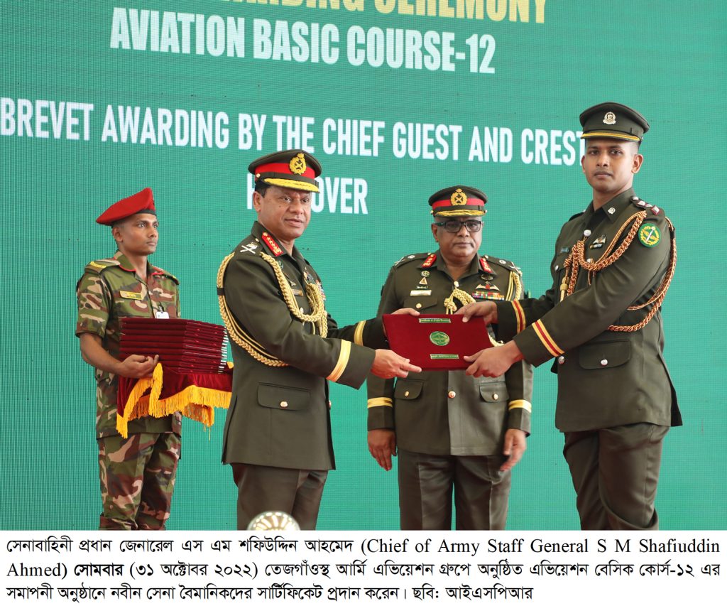 সেনাবাহিনীর এভিয়েশন বেসিক কোর্স-১২ এর ব্রেভেট ও সার্টিফিকেট প্রদান