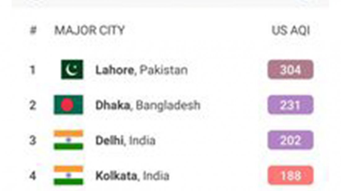 বায়ু দূষণে বিশ্বে আজ প্রথম অবস্থানে আছে পাকিস্তানের লাহোর। আর ঢাকা রয়েছে দ্বিতীয় অবস্থানে। গত কয়েকদিন দূষণ কিছুটা কম ছিল। তবে আজ তা অন্য কয়েকদিনের তুলনায় অনেক বেশি।