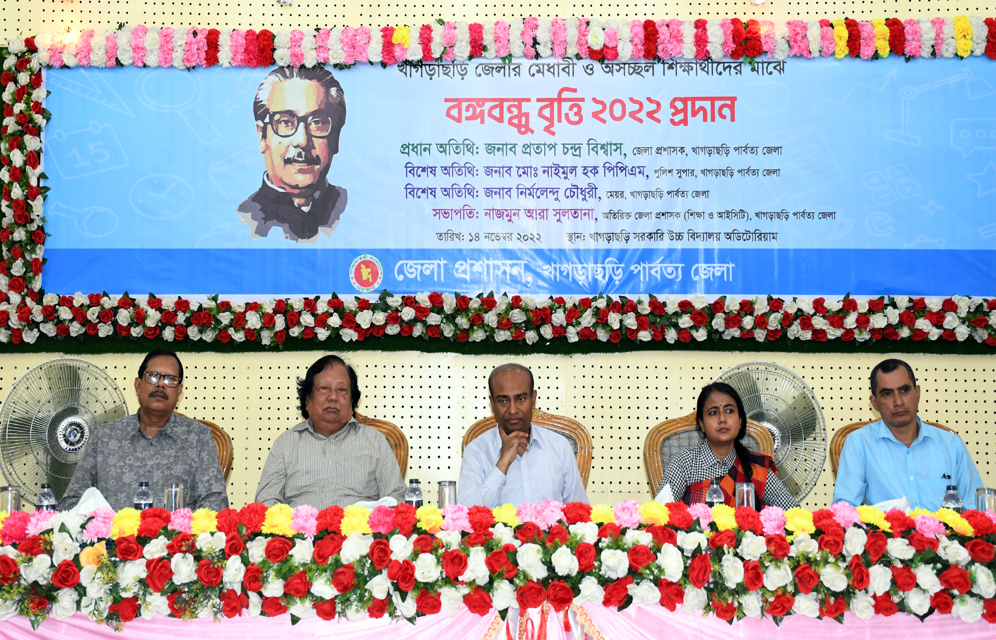 উল্ল্যেখ, জেলা প্রশাসনের উদ্যোগে দ্বিতীয় বারের মত খাগড়াছড়ি বিভিন্ন উপজেলার একাদশ থেকে দ্বাদশ শ্রেণির ১০ শিক্ষার্থীকে ৭ হাজার টাকা করে এবং কলেজ, বিশ^বিদ্যালয়, মেডিকেল বিশ^বিদ্যালয়সহ বিভিন্ন বিশ^বিদ্যালয়ের মোট ৬২ জন শিক্ষার্থীকে ১০ হাজার টাকা করে বঙ্গবন্ধু বৃত্তি প্রদান করা হয়।