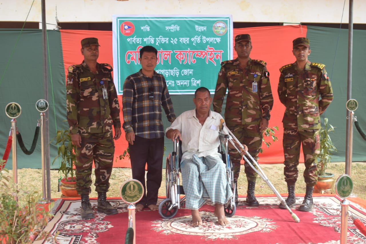 পার্বত্য চট্টগ্রাম শান্তি চুক্তির রজত জয়ন্তী উদযাপন উপলক্ষে খাগড়াছড়িতে দুই শতাধিক হতদরিদ্রের পাশে দাঁড়িয়ে বিনামূল্যে চিকিৎসা সেবা, ও ঔষধ এবং ২টি হুইল চেয়ার বিতরণ করেছে বাংলাদেশ সেনাবাহিনী। খাগড়াছড়ি জেলা সদরের গাছবান উচ্চ বিদ্যালয় মাঠে এই মেডিকেল ক্যাম্পেইনের আয়োজন করে খাগড়াছড়ি সদর জোন।