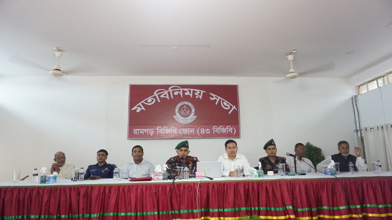 সকালে (মঙ্গলবার) বিজিবির রামগড় ব্যাটালিয়নের হলরুমে মাদক ও চোরাচালান দমন, আইন-শৃংখলা রক্ষা করা, অস্ত্র চোরাচালান প্রতিরোধ, অবৈধ সীমান্ত পারাপার, সীমান্ত আইন (ভারত-বাংলাদেশ সীমান্ত চুক্তি ১৯৭৫), সন্ত্রাসী কর্তৃক চাঁদা আদায়, অবৈধ কাঠ ব্যবসা, শান্তি ও সম্প্রীতি (সামাজিক সম্প্রীতি, ধর্মীয় সম্প্রীতি, জাতিগত সম্প্রীতি) এবং সড়ক দূর্ঘটনা সংক্রান্ত বিষয়ে পুলিশ, বিজিবি, স্থানীয় প্রশাসনিক কর্মকর্তা, জনপ্রতিনিধির সমন্বয়ে আয়োজিত মতবিনিময় সভায় সভাপতির বক্তব্যে এসব কথা বলেন জোন অধিনায়ক।