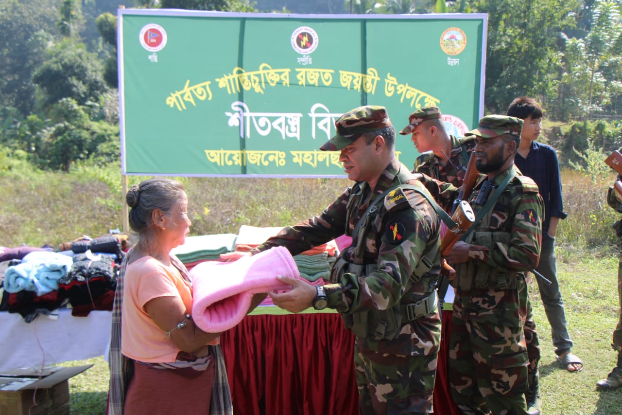 ঐতিহাসিক পার্বত্য চট্টগ্রাম শান্তি চুক্তি বাস্তবায়নের রজত জয়ন্তীতে মহালছড়ি জোনের উদ্যোগে আজ (৩০ নভেম্বর) বুধবার প্রত্যন্ত অঞ্চল বাজেছড়া এলাকায় প্রায় দুই শতাধিক শীতার্তদের মাঝে কম্বল ও শীতবস্ত্র বিতরণ করা হয়। এছাড়াও স্থানীয় স্কুল শিক্ষার্থীদের মাঝে শিক্ষা সহায়ক সামগ্রী ও খেলাধুলার সামগ্রী বিতরণ করা হয়।