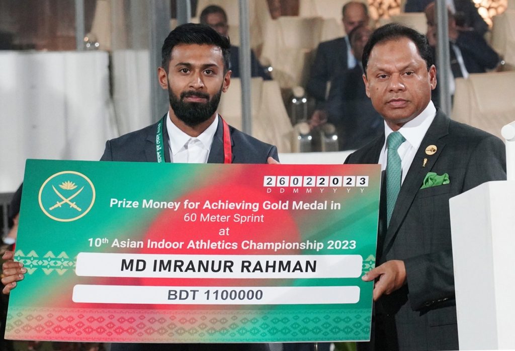 বাংলাদেশের হয়ে এশিয়ান ইনডোরে প্রথমবারের মতো স্বর্ণ জয়ের গৌরব এনে দেন ইমরানুর রহমান। দেশের এই দ্রুততম মানবের অবিস্মরণীয় অর্জনে বিভিন্ন প্রতিষ্ঠান অংশীদার হচ্ছে। আর্থিকভাবে পুরস্কৃত করা হচ্ছে তাকে। এবার স্বর্ণজয়ী ইমরানুরকে ১১ লাখ টাকা প্রদান করেছে সেনাবাহিনী।