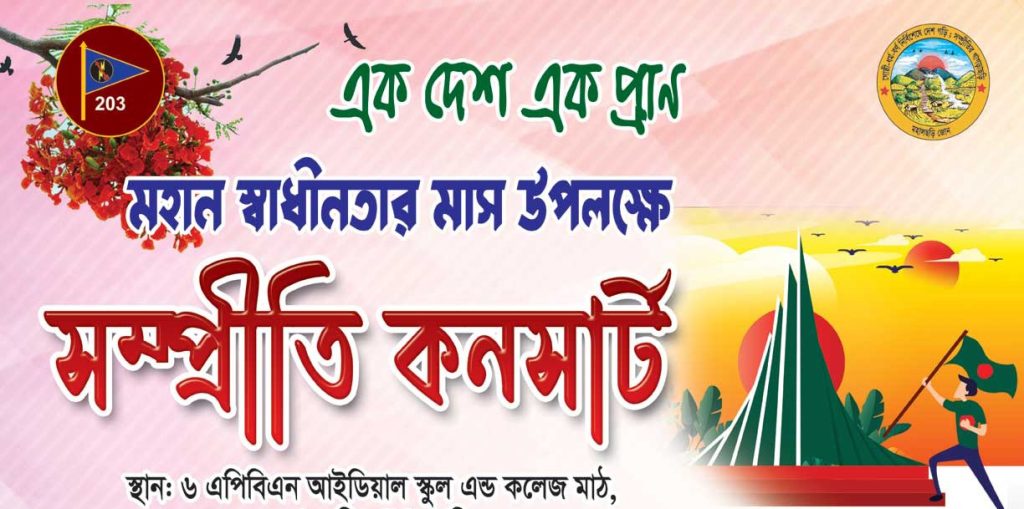 আর এ মাসেই এবার পাহাড়ি জেলা খাগড়াছড়িতে এক অনন্য আয়োজন করেছে সেনাবাহিনীর খাগড়াছড়ি রিজিয়য়নের আওতাধীন মহালছড়ি জোন। ‘এক দেশ, এক প্রাণ’ স্লোগানকে ধারণ করে মহান স্বাধীনতার মাস উপলক্ষে মহালছড়ি সেনা জোন আয়োজন করেছে “সম্প্রীতি কনসার্ট”র।