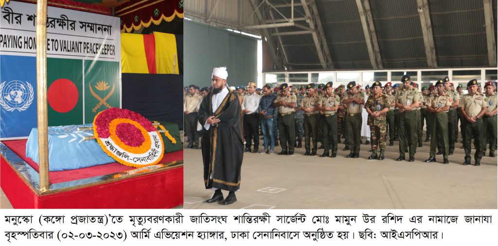চিকিৎসাধীন থাকাবস্থায় মৃত্যুবরণকারী জাতিসংঘ শান্তিরক্ষী সার্জেন্ট মো. মামুন উর রশিদের জানাজা বৃহস্পতিবার (২ মার্চ) ঢাকা সেনানিবাসের আর্মি অ্যাভিয়েশন হ্যাঙ্গারে অনুষ্ঠিত হয়েছে।