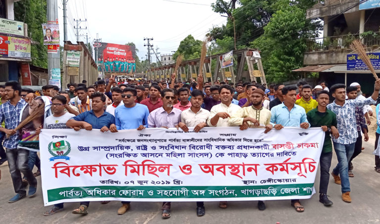 চলতি বছরের ২৬ ফেব্রুয়ারি জাতীয় সংসদে দাড়িয়ে পার্বত্য চট্টগ্রামের সংরক্ষিত নারী সংসদ সদস্য বাসন্তি চাকমা কর্তৃক দেয়া বক্তব্যকে উগ্র, সাম্প্রদায়িক ও অসাংবিধানিক মিথ্যা, ভিত্তিহীন এবং উপজাতি আঞ্চলিক সশস্ত্র সন্ত্রাসী সংগঠনগুলোর এজেন্ডা বাস্তবায়নের ষড়যন্ত্রের অংশ দাবি করে তা প্রত্যাহার, ক্ষমা প্রার্থনা ও সংসদ সদস্য পদ থেকে পদত্যাগ এবং নিজ সংসদীয় এলাকা ত্যাগের দাবি জানিয়ে খাগড়াছড়িতে ঝাড়ু ও প্রতিবাদ মিছিল করেছে পার্বত্য অধিকার ফোরাম।