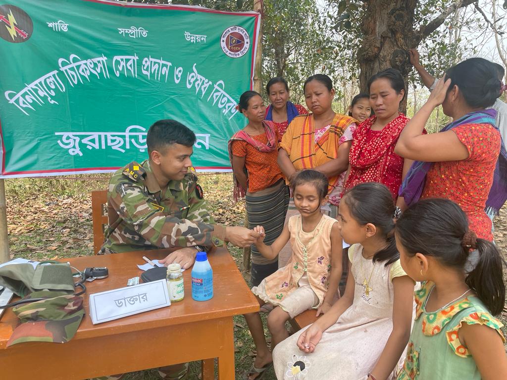 তারই অংশ হিসেবে প্রত্যন্ত এলাকার জনগণকে চিকিৎিসা সেবা প্রদানের লক্ষে রাঙামাটির জুরাছড়িতে শতাধিক রোগীকে বিনামূল্যে চিকিৎসা দিয়েছে সেনাবাহিনীর জুরাছড়ি জোন।