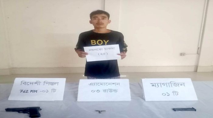 শুক্রবার (২৮ এপ্রিল) ভোর ৪টার দিকে পানছড়ি উপজেলার আলীচান কারবারী পাড়ায় সেনাবাহিনীর একটি টহল দল অভিযান পরিচালনা করে নয়ন্ত চাকমাকে (২৫) একটি ৭.৬২ এমএম বিদেশী পিস্তল, একটি ম্যাগাজিন এবং তিন রাউন্ড তাজা এ্যামোনিশনসহ হাতে-নাতে আটক করতে সক্ষম হয়।