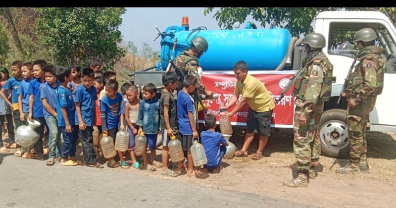 বর্তমান তীব্র গ্রীষ্মের তাপদাহে সমতল ভূমির পাশাপাশি পার্বত্য অঞ্চলে ব্যাপক হারে পানির সংকট দেখা দিয়েছে। প্রতিনিয়তই পার্বত্য অঞ্চলের জীবন যুদ্ধে হার না মানা নিরীহ মানুষগুলো পানির বিরুদ্ধে কঠিন সংগ্রাম করে যাচ্ছে। বিষয়টি তাৎক্ষণিকভাবে নজরে নিয়ে আসে বাংলাদেশ সেনাবাহিনী। বান্দরবান সেনা জোনের আওতাধীন চিম্বুক ও তার পার্শ্ববর্তী বিভিন্ন দুর্গম এলাকায় বান্দরবান সেনা জোনের অধিনায়ক লেঃ কর্ণেল মাহমুদুল হাসান এর নির্দেশে জোন উপ-অধিনায়ক এস এম মেজর মাহমুদুল হাসান সরজমিনে পাড়াগুলো পরিদর্শন এবং স্থানীয় বাসিন্দাদের সাথে পানি সংকট নিরসনের বিষয়টি নিয়ে আলোচনা করেন।