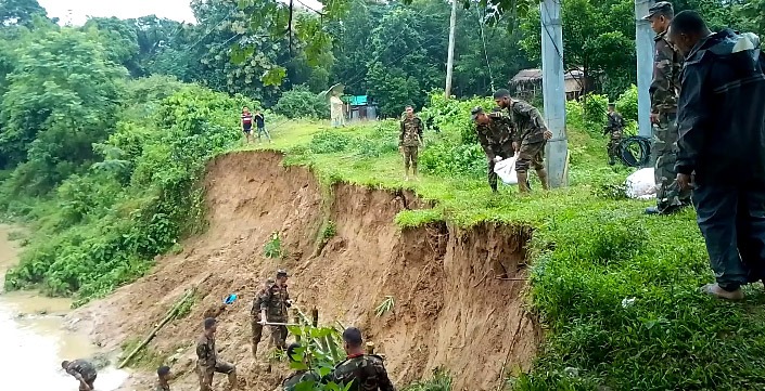 প্রবল বৃষ্টি ও ভারী বর্ষণে ঝুঁকিতে থাকা বৈদ্যুতিক খুঁটি রক্ষায় কাজ করছে সেনাবাহিনী