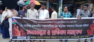 এদিকে, একই দাবিতে খাগড়াছড়িতে মানববন্ধন ও প্রতিবাদ সমাবেশ করেছে পার্বত্য চট্টগ্রাম নাগরিক পরিষদ ও এর সহযোগী সংগঠনগুলো। দুপুরে খাগড়াছড়ি জেলা সদরের শাপলা চত্বরে এ মানববন্ধন ও প্রতিবাদ সমাবেশ অনুষ্ঠিত হয়।