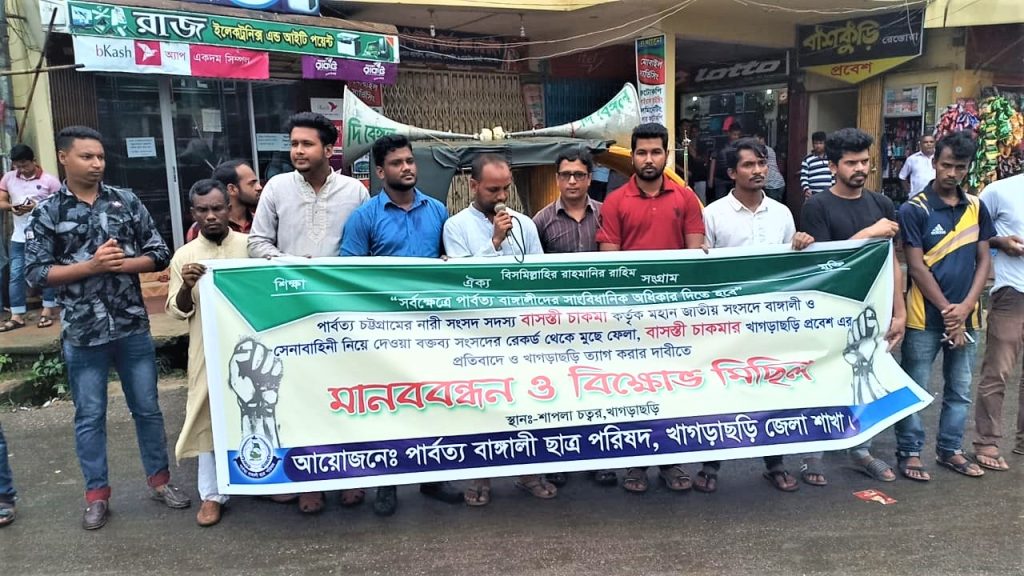 পার্বত্য চট্টগ্রামে বসবাসরত বাঙ্গালী সম্প্রদায় ও এ অঞ্চলের অখন্ডতা রক্ষায় নিয়োজিত বাংলাদেশ সেনাবাহিনীকে নিয়ে গত ২৬ শে ফেব্রুয়ারি মহান সংসদে দাড়িয়ে নারী সাংসদ বাসন্তি চাকমা কর্তৃক দেয়া কুরুচিপূর্ন বক্তব্য সংসদের রেকর্ড থেকে মুছে ফেলা, রাতের আঁধারে খাগড়াছড়িতে প্রবেশের প্রতিবাদ ও অবিলম্বে খাগড়াছড়ি ত্যাগের দাবিতে খাগড়াছড়ি শহরে মানববন্ধন ও বিক্ষোভ মিছিল পালন করেছে পার্বত্য বাঙ্গালী ছাত্র পরিষদের নেতা-কর্মীরা।
