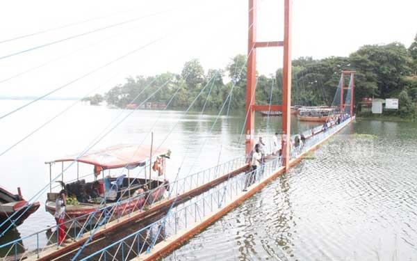 টানা বর্ষণ এবং পাহাড়ি ঢলের কারণে কাপ্তাই হ্রদের পানি বৃদ্ধি পাওয়ায় ডুবে গেছে রাঙামাটির ঝুলন্ত সেতু।