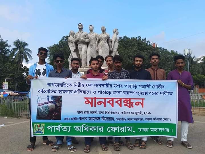 খাগড়াছড়ি দিঘীনালা ৯ মাইল নামক সড়কের উপর উপজাতীয় সশস্ত্র সন্ত্রাসী কর্তৃক চাঁদার জন্য বাঙালি ব্যবসায়ী কে ব্রাশ ফায়ার করার প্রতিবাদ জানিয়ে ঢাকা বিশ্ববিদ্যালয়ের রাজু ভাস্কর্যে মানববন্ধন করেছে পার্বত্য অধিকার ফোরাম ঢাকা মহানগর শাখা।