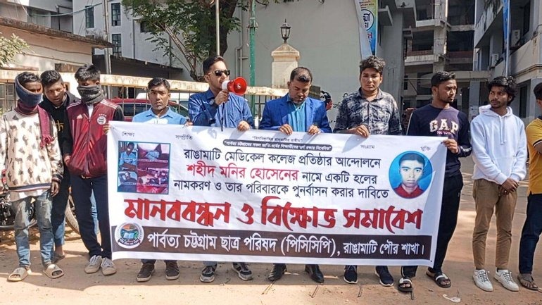 মানববন্ধনে পার্বত্য চট্টগ্রাম ছাত্র পরিষদ পিসিসিপি রাঙামাটি পৌর শাখা জোর দাবি জানায় অবিলম্বে ‘শহীদ’ মনির হোসনের নামে মেডিকেল কলেজের একটি হলের নামকরণ করতে হবে এবং তার পরিবারকে পুনর্বাসন করতে হবে ও একই দিন জেএসএস সন্ত্রাসীদের হামলায় গুরতর আহত জামাল হোসেনকে ক্ষতিপূরণ দিতে হবে। তাদের দাবি, অবিলম্বে মেডিকেল কলেজ এর স্থায়ী ক্যাম্পাসের কার্যক্রম দ্রুত শুরু করতে হবে, অন্যথায় পিসিসিপি আন্দোলনে নামতে বাধ্য হবে।