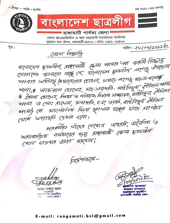 ২৩ জুলাই মঙ্গলবার রাঙ্গামাটি জেলা ছাত্রলীগ সভাপতি আব্দুল জব্বার সুজন ও সাধারন সম্পাদক প্রকাশ চাকমা স্বাক্ষরিত এক জরুরী প্রেস বিজ্ঞপ্তিতে এই অব্যহতি ঘোষণা করা হয়। এতে আরো উল্লেখ করা হয়, পরবর্তীতে উপোরক্ত বহিষ্কৃত কর্মীদের যেকোন অপরাধ, অনৈতিক ও অসামাজিক কর্মকান্ডের জন্য রাঙ্গামাটি জেলা ছাত্রলীগ কোন দায়ভার গ্রহণ করবে না।