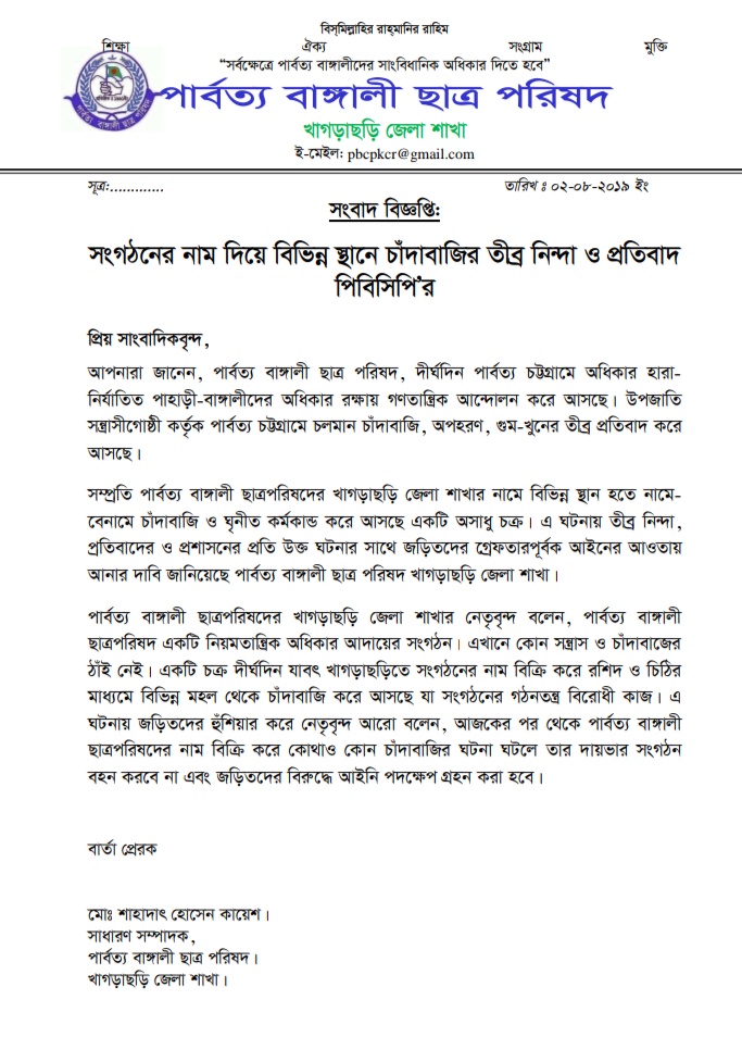 সংবাদ বিজ্ঞপ্তিতে আরো বলা হয়, সম্প্রতি পার্বত্য বাঙ্গালী ছাত্রপরিষদের খাগড়াছড়ি জেলা শাখার নামে বিভিন্ন স্থান হতে নামে-বেনামে চাঁদাবাজি ও ঘৃনীত কর্মকান্ড করে আসছে একটি অসাধু চক্র। এ ঘটনায় তীব্র নিন্দা, প্রতিবাদের ও প্রশাসনের প্রতি উক্ত ঘটনার সাথে জড়িতদের গ্রেফতারপূর্বক আইনের আওতায় আনার দাবি জানিয়েছে পার্বত্য বাঙ্গালী ছাত্র পরিষদ খাগড়াছড়ি জেলা শাখা।