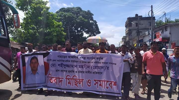 রাঙ্গামাটি সদর উপজেলা পরিষদ চেয়ারম্যান মোঃ শহীদুজ্জামান মহসীন রোমানের কাছে চাঁদা দাবি ও উপজাতি আঞ্চলিক সন্ত্রাসী কর্তৃক প্রাণ নাশের হুমকির প্রতিবাদে জেলা শহরে মিছিল ও সমাবেশ করেছে জেলা অটোরিক্সা শ্রমিক ইউনিয়ন ও চালক কল্যাণ সমিতি।