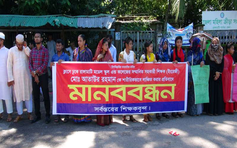 স্কুল শিক্ষককে মারধরের প্রতিবাদে রাঙামাটিতে মানববন্ধন