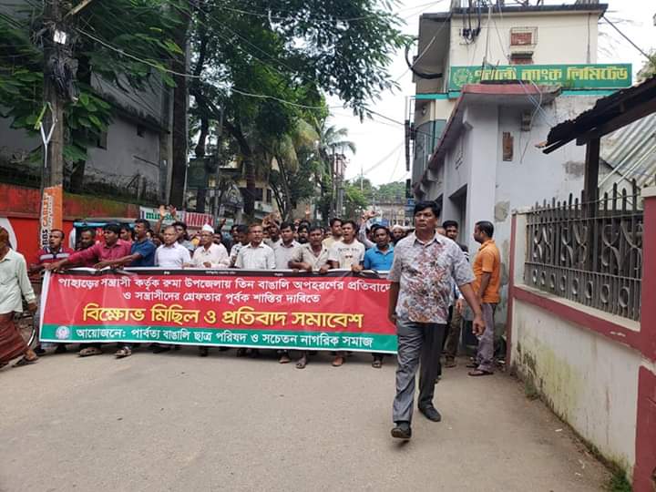 বান্দরবানের রুমা উপজেলা থেকে উপজাতি সশস্ত্র সন্ত্রাসীগোষ্ঠী কর্তৃক গত ১৯ আগষ্ট অস্ত্রের মুখে জিম্মি করে ৩ গাড়ি চালককে অপহরণের প্রতিবাদে আবারো বিক্ষোভ মিছিল ও প্রতিবাদ সমাবেশে উত্তাল সম্প্রীতির জেলা হিসেবে পরিচিত বান্দরবান।