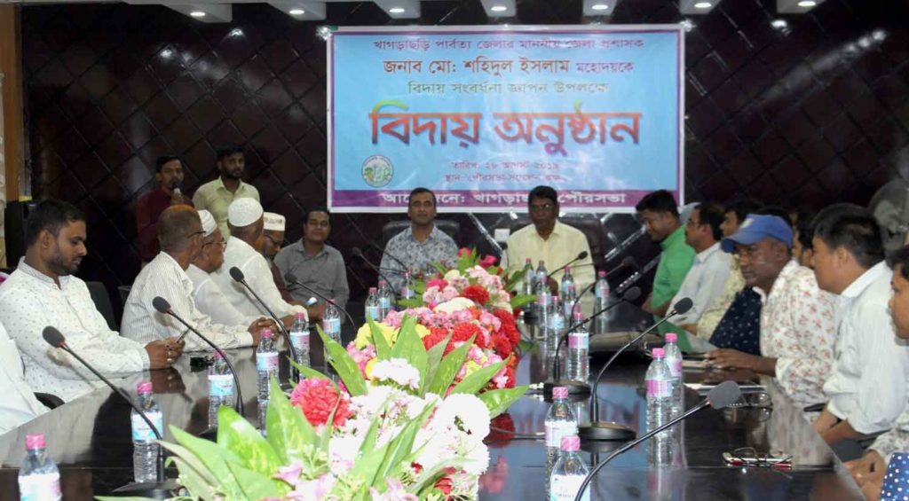 খাগড়াছড়ির বিদায়ী জেলা প্রশাসক মো: শহিদুল ইসলামকে সংবর্ধনা দিয়েছে খাগড়াছড়ি পৌরসভা। বুধবার (২৮ আগষ্ট) বিকেলে খাগড়াছড়ি পৌরসভার সম্মেলন কক্ষে আয়োজিত বিদায় সংবর্ধনায় সভাপতিত্ব করেন পৌর মেয়র মো: রফিকুল আলম।