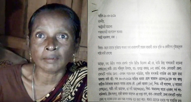 শ্বশুর বাড়িতে গলায় রশি পেছিয়ে এক যুবককে হত্যা করা হয়েছে উল্লেখ করে সন্তান হত্যায় জড়িতদের দৃষ্টান্তমূলক শাস্তির দাবিসহ স্থানীয় প্রভাবশালী চক্রের হয়রানির থেকে মুক্তি পেতে স্বরাষ্ট্রমন্ত্রীর হস্তক্ষেপ চেয়ে আবেদন জানিয়েছেন এক বৃদ্ধ মা।