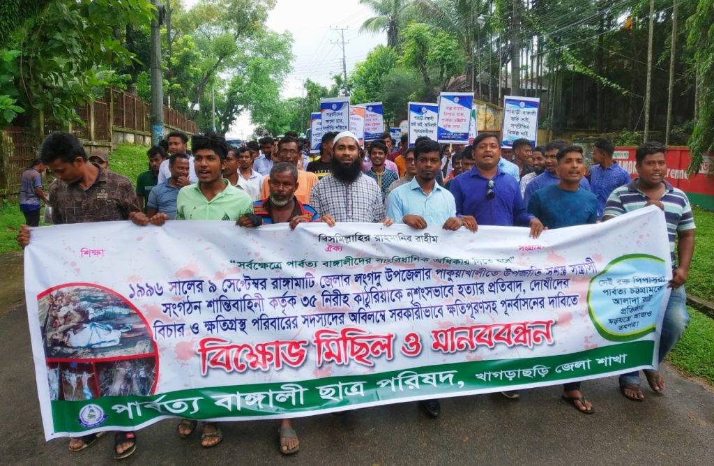 ১৯৯৬ সালের ৯ সেপ্টেম্বর তৎকালীন উপজাতি বিচ্ছিন্নতাবাদী সন্ত্রাসী গ্রুপ শান্তিবাহিনী কর্তৃক লংগদুর ৩৫ কাঠুরিয়াকে প্রতারণা করে ব্যবসায়িক হিসাবের কথা বলে পাকুয়াখালীর গহীন অরণ্যে ডেকে নিয়ে কাঠুরিয়াদের হাত-পা ও চোখ বেঁধে নির্যাতন চালিয়ে হত্যার প্রতিবাদ, হত্যাকারীদের বিচার ও ক্ষতিগ্রস্থ পরিবারের সদস্যদের অবিলম্বে সরকারীভাবে ক্ষতিপূরন ও পূর্নবাসন করার দাবিতে খাগড়াছড়িতে বিক্ষোভ মিছিল ও মানববন্ধন করেছে পার্বত্য বাঙ্গালী ছাত্র পরিষদ।