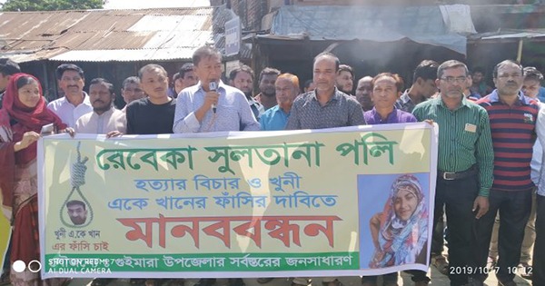 খাগড়াছড়ির গুইমারার বাসিন্দা ও চট্টগ্রামের হালিশহর আহম্মদ মিয়া সিটি কর্পোরেশন বালিকা উচ্চ বিদ্যালয়ের ৬ষ্ঠ শ্রেনীর ছাত্রী রেবেকা সুলতানা পলি হত্যার বিচার ও হত্যাকারী লম্পট বাড়িওয়ালা এ. কে খানের ফাঁসির দাবিতে গুইমারাতে মানববন্ধন অনুষ্ঠিত হয়েছে। সোমবার (৭অক্টোবর) সকাল ১০টায় গুইমারা উপজেলা সদরে গুইমারা উপজেলার সর্বস্তরের মানুষের আয়োজনে অনুষ্ঠিত মানববন্ধনে বিভিন্ন শ্রেণী পেশার হাজারো মানুষ অংশগ্রহন করেন।