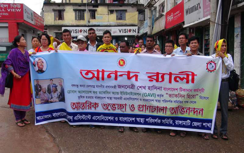 গ্লোবাল এলায়েন্স ফর ভ্যাক্সিনেশন এন্ড ইমুনাইজেশন (জিএভিআই) কর্তৃক ভ্যাকসিন হিরো পুরস্কারে ভূষিত হওয়ায় প্রধানমন্ত্রী শেখ হাসিনাকে অভিনন্দন ও শুভেচ্ছা জানিয়ে রাঙামাটিতে এক আনন্দ র্যালী করেছে বাংলাদেশ স্বাস্থ্য বিভাগের স্বাস্থ্য সহকারীদের সংগঠন বাংলাদেশ হেলথ এসিস্ট্যান্ট এসোসিয়েশন ও বাংলাদেশ স্বাস্থ্য পরিদর্শক সমিতি, রাঙামাটি জেলা শাখা। বৃহস্পতিবার (১০অক্টোবর) বিকেলে শহরের বনরুপা চৌমোহনী থেকে বিভিন্ন সড়ক পদক্ষিণ শেষে র্যালীটি জেলা প্রশাসক কার্যালয় প্রাঙ্গণে এসে এক সংক্ষিপ্ত আলোচনাসভায় মিলিত হয়।