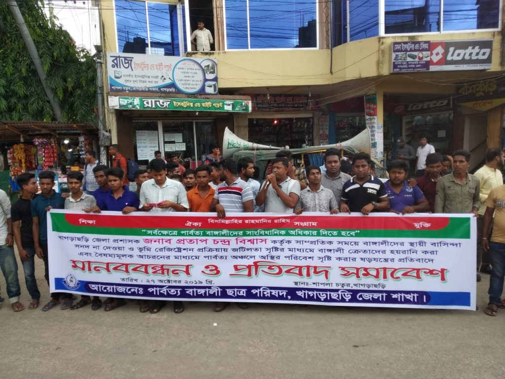 জেলা প্রশাসক কর্তৃক বাঙ্গালীদের স্থায়ী বাসিন্দা সনদ ও ভূমি রেজিষ্ট্রেশনে জটিলতা সৃষ্টির প্রতিবাদে উত্তাল খাগড়াছড়ি