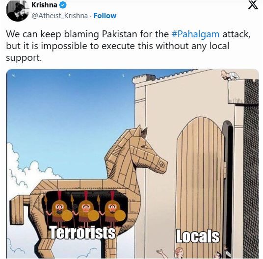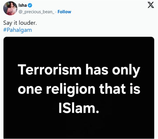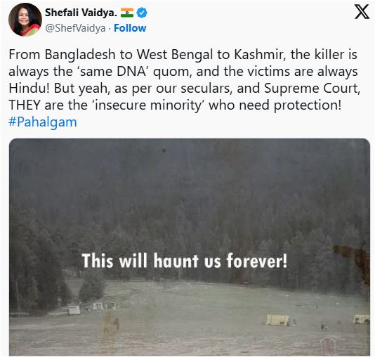 কাশ্মীরের পেহেলগামে পর্যটকদের উপর বন্দুকধারীদের হামলায় অন্তত ২৬ জন নিহত হয়েছেন। এই ঘটনাটির পর উগ্র হিন্দুত্ববাদীরা সোশ্যাল মিডিয়ায় মুসলিম বিরোধী বক্তব্য প্রচার শুরু করেছে। মাক্তুব মিডিয়ার এক প্রতিবেদন থেকে জানা যায়, সোশ্যাল মিডিয়া প্ল্যাটফর্ম এক্স-এ মুসলিমদের গণহত্যার ডাক ও কাশ্মীরে অর্থনৈতিক বয়কটের আহ্বান জানানো হয়েছে।