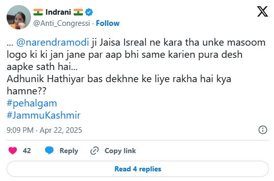 এক ব্যক্তি মন্তব্য করেন, এটি ভারতের ৭ অক্টোবর। অনেকে আবার জম্মুর জন্য পৃথক শাসন অঞ্চল দাবি করেছেন। এর পাশাপাশি, হামলার স্থানে কেন সামরিক বাহিনী ছিল না, তা নিয়ে সরকারের কাছে প্রশ্ন তোলা হয়েছে।