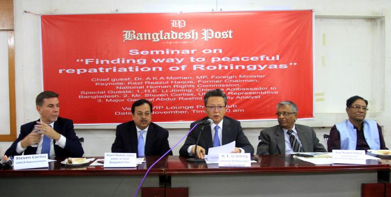 ২০১৭ সালের আগষ্ট মাসে মিয়ানমারের সেনাবাহিনীর হাতে ব্যাপক নির্যাতনের স্বীকার হয়ে জীবন বাঁচাতে সীমান্ত অতিক্রম করে বাংলাদেশের কক্সবাজারের আশ্রয় নেয়া ও এর আগে বিভিন্ন সময়ে এদেশে অনুপ্রবেশ করা রোহিঙ্গাদের নিরাপদে নিজ দেশে প্রত্যাবাসনে নতুন করে একটি কাঠামোভিত্তিক প্রস্তাবনা পেশ করেছে চীন। ২৪ নভেম্বর রবিবার ঢাকায় জাতীয় প্রেস ক্লাবে অনুষ্ঠিত ‘রোহিঙ্গাদের শান্তিপূর্ণ প্রত্যাবাসনের উপায় সন্ধান’ শীর্ষক এক সেমিনারে চীনের রাষ্ট্রদূত এইচ ই লি জিমিং রোহিঙ্গাদের তাদের নিজ দেশে ফেরাতে নতুন এই ‘ওয়ান প্লাস ওয়ান প্লাস টু’ প্রস্তাব পেশ করেন।